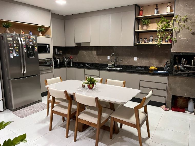 Cozinha Gourmet de alto padrão, com bancadas de mármore, armários planejados e churrasqueira, além de porta de blindex que conecta o espaço ao jardim